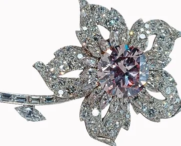 The Williamson Brooch boasts an incredible round cut, pale pink center stone, which is said to be the finest pink diamond ever discovered. The uncut stone was first given to Princess Elizabeth as a wedding gift in 1947 weighing in at 54.5cts, and was later faceted into a brilliant cut round stone of 23.6cts, maximizing its color and brilliance. In 1953 Frederick Mew of Cartier created the jonquil flower brooch with the stone as seen above.
