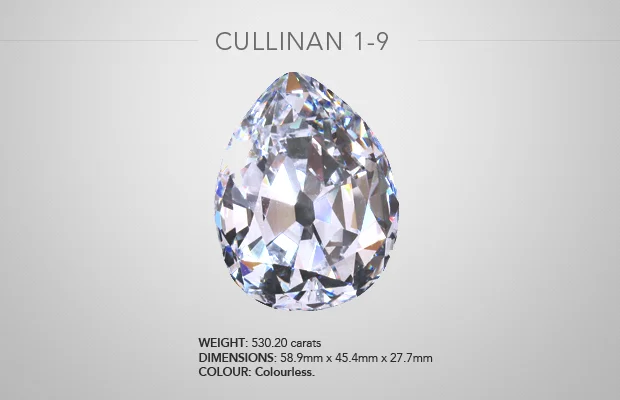 Our journey begins with a diamond discovered at the Premier mine near Pretoria South Africa in 1905. The Cullinan Diamond weighed in at 1.37 pounds, and had an estimated carat weight of 3,106. This enormous rock was so big, that it was cut into 9 different jewelry-quality stones. The largest cut from the Cullinan is still the largest polished white diamond in the world.